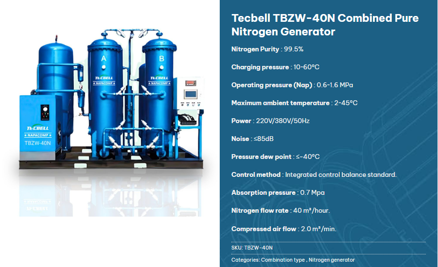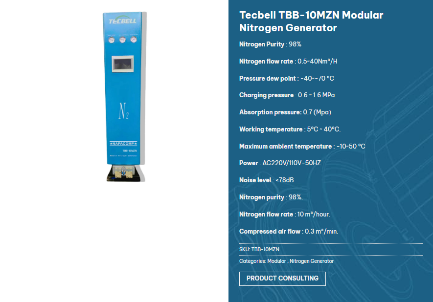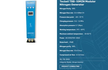 Affirming business reputation: Tecbell TBB-120N Nitrogen Gas Generator not only helps businesses improve production efficiency but also plays an important role in affirming professionalism and reputation in the market. Owning this modern equipment is an important step forward, helping businesses develop and improve their competitive position in the industry.
