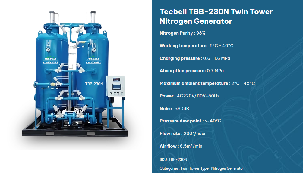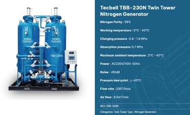 Tecbell TBB-120N industrial Nitrogen generator is a twin tower Nitrogen generator that is popular and trusted by many people thanks to the following strengths:
