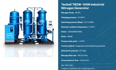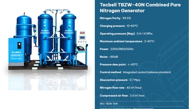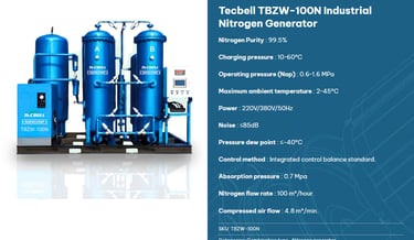 The Tecbell TBB-120N Super Fast Nitrogen Generator is the perfect choice for businesses looking for an efficient and energy-saving nitrogen production solution. With advanced technology, flexible design and outstanding performance, this product meets all modern production needs.
